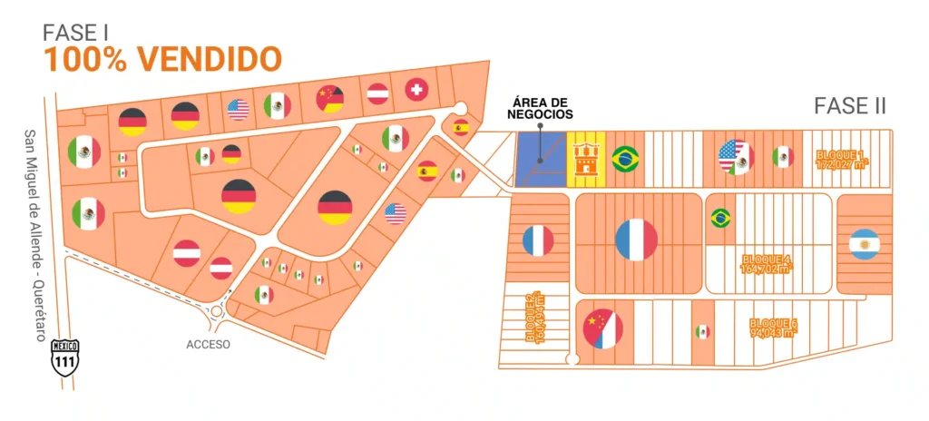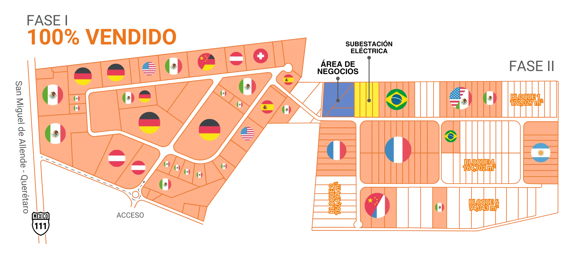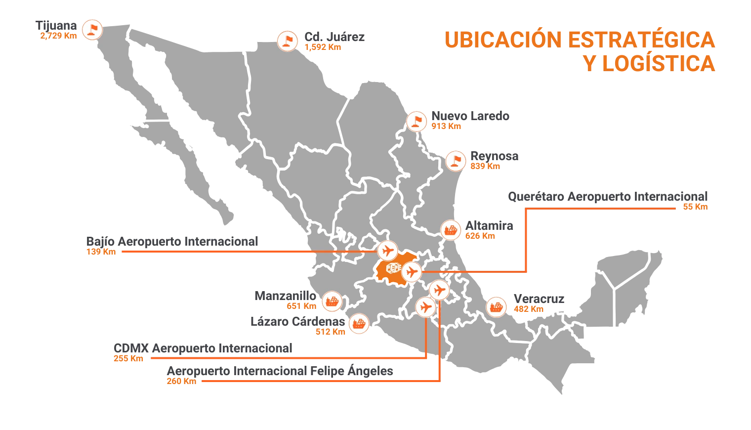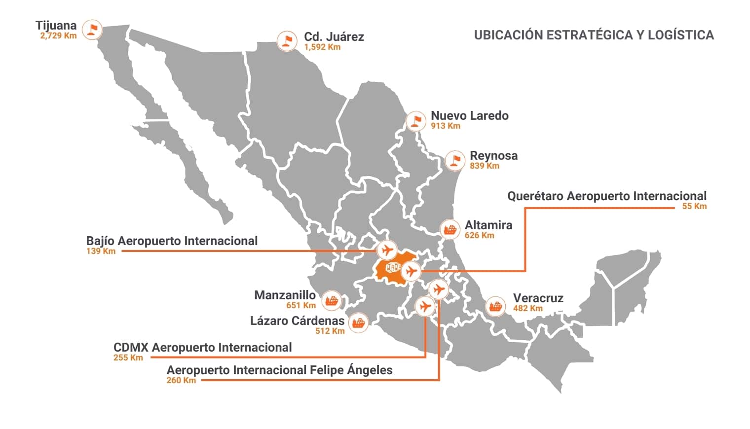 - Alcance del mercado: En un radio de 400 km alrededor del parque, los inversionistas pueden acceder a 80% del mercado total de México, 70% de su base industrial y 60% de la población total.