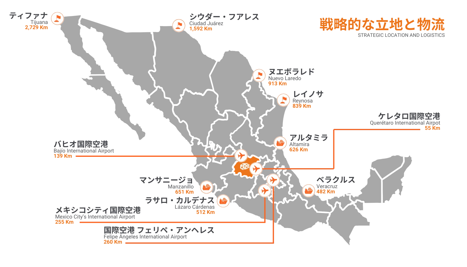 - 市場リーチ: 同公園から半径250マイル以内であれば、投資家は以下のサービスを受けることができる。 メキシコ市場全体の80%, 産業基盤の70%、総人口の60%を占める。