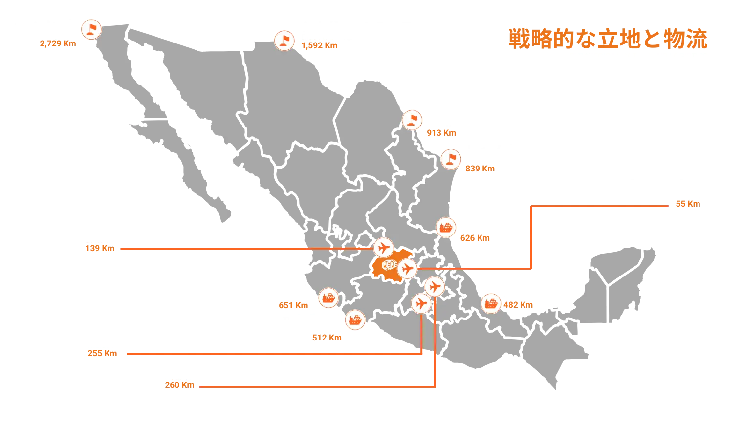 - 市場リーチ: 同公園から半径250マイル以内であれば、投資家は以下のサービスを受けることができる。 メキシコ市場全体の80%, 産業基盤の70%、総人口の60%を占める。